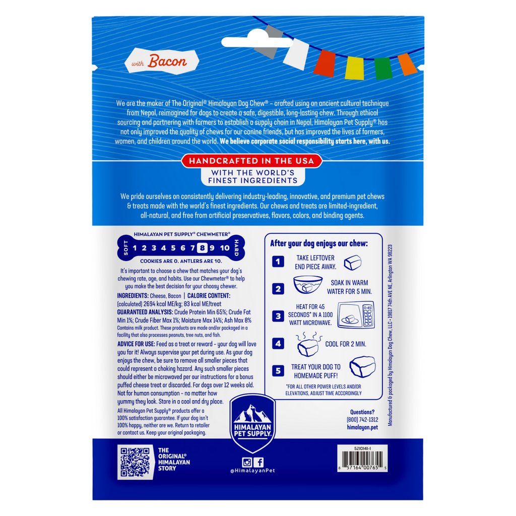 Himalayan Dog Chew Bacon is the original, long-lasting, hard cheese chew that your dogs have come to know and love, simply with more flavor! Himalayan Dog Chew Bacon flavored hard cheese chews are made using our traditional Himalayan Cheese recipe by adding bits of peanuts in with the cheese. Our chews are naturally smoked and have no artificial binding ingredients.