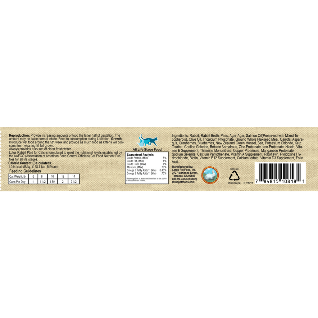 Lotus Rabbit Recipe Pate is formulated to meet the nutritional levels established by the AAFCO (Association of American Feed Control Officials) Cat Food Nutrient Profiles for all life stages.
