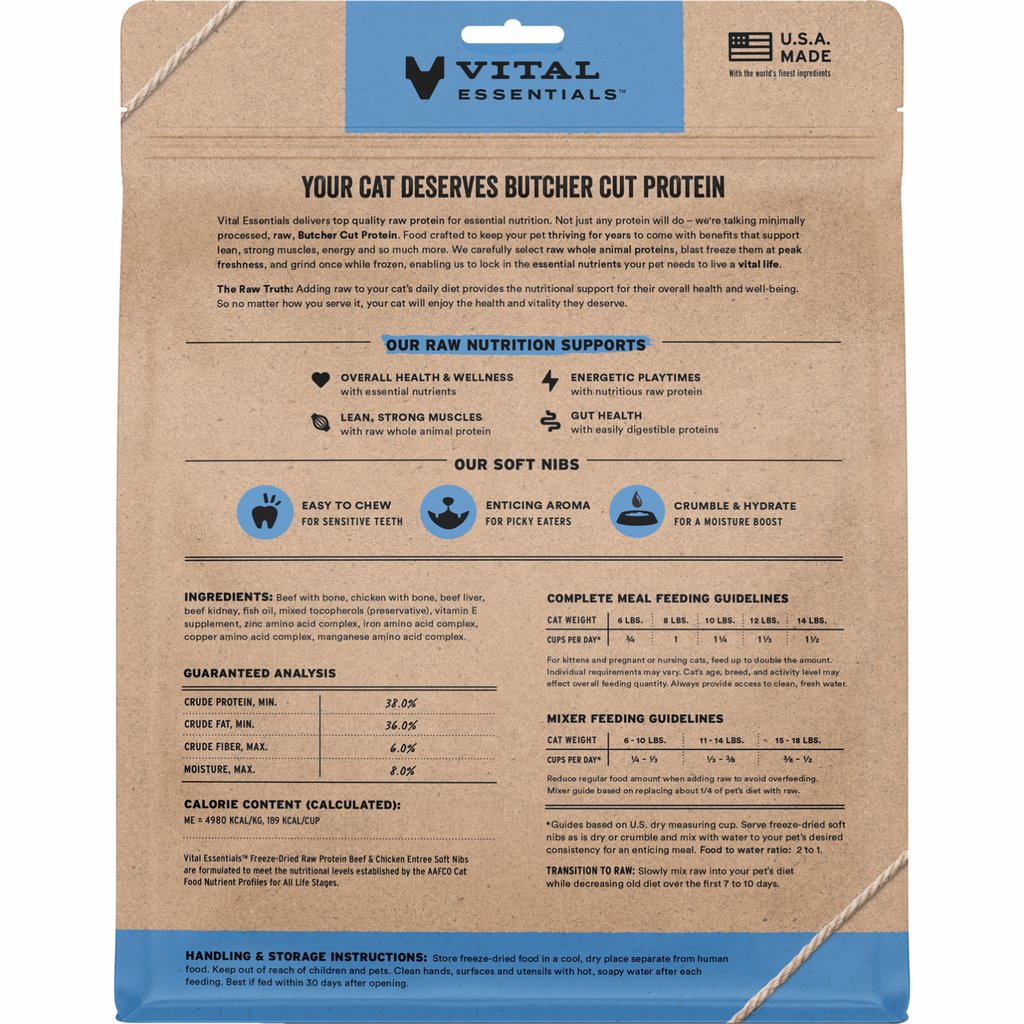Vital Essentials® Freeze-Dried Raw Protein Beef & Chicken Entree Soft Nibs are formulated to meet the nutritional levels established by the AAFCO Cat Food Nutrient Profiles for All Life Stages.
