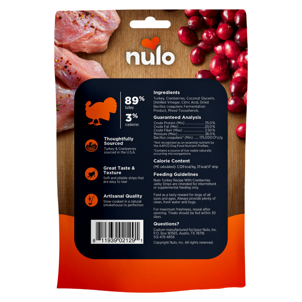 Nulo Jerky Strips turkey with cranberries recipe is intended for intermittent or supplemental feeding only.