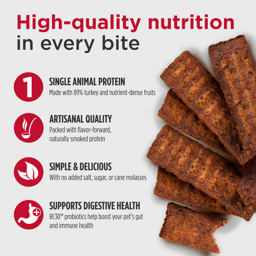 Our smokehouse-slow-cooked jerky strips pack real turkey and tart cranberries into every soft, tearable bite. No fillers, just advanced probiotics that support gut health and single-source protein that won’t upset your dog’s sensitive stomach. Tear off in pieces for training, or share whole for those incredible bonding moments.