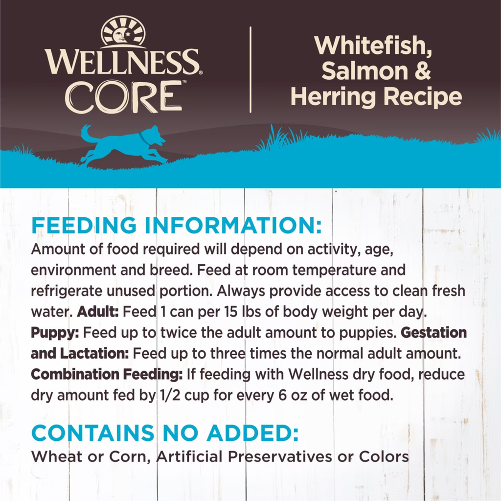 Combination Feeding: If feeding with Wellness dry food, reduce dry amount fed by 1/2 cup for every 6 oz of wet food.