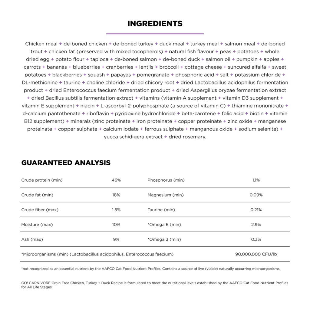 Chicken meal, de-boned chicken, de-boned turkey, duck meal, turkey meal, salmon meal, de-boned trout, chicken fat (preserved with mixed tocopherols), natural fish flavor, peas, potatoes, whole dried egg, potato flour, tapioca, de-boned salmon, de-boned duck, salmon oil, pumpkin, apples, carrots, bananas, blueberries, cranberries, lentils, broccoli, cottage cheese, suncured alfalfa, sweet potatoes, blackberries, squash, papayas, pomegranate, phosphoric acid, salt, potassium chloride, DL-methionine, taurine, choline chloride, dried chicory root, dried Lactobacillus acidophilus fermentation product, dried Enterococcus faecium fermentation product, dried Aspergillus oryzae fermentation extract, dried Bacillus subtilis fermentation extract, vitamins (vitamin A supplement, vitamin D3 supplement, vitamin E supplement, niacin, L-ascorbyl-2-polyphosphate (a source of vitamin C), thiamine mononitrate, d-calcium pantothenate, riboflavin, pyridoxine hydrochloride, beta-carotene, folic acid, biotin, vitamin B12 supplement.), minerals (zinc proteinate, iron proteinate, copper proteinate, zinc oxide, manganese proteinate, copper sulfate, calcium iodate, ferrous sulfate, manganous oxide, sodium selenite.), yucca schidigera extract, dried rosemary.