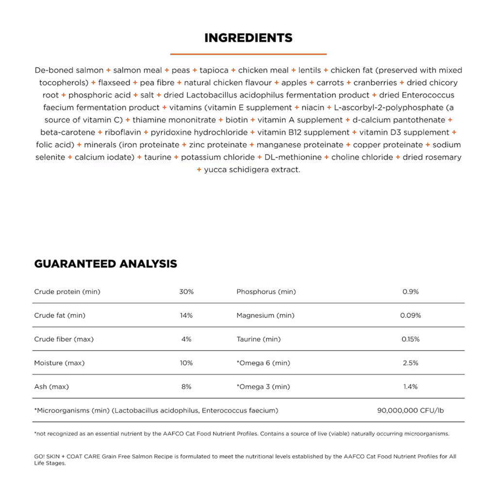 Crafted from premium-quality salmon, this delicious GO! SOLUTIONS recipe helps control shedding and supports healthy skin and coats, with added fruit and veggies to support your feline friend’s immune function, and pre and probiotic fiber for healthy digestion.