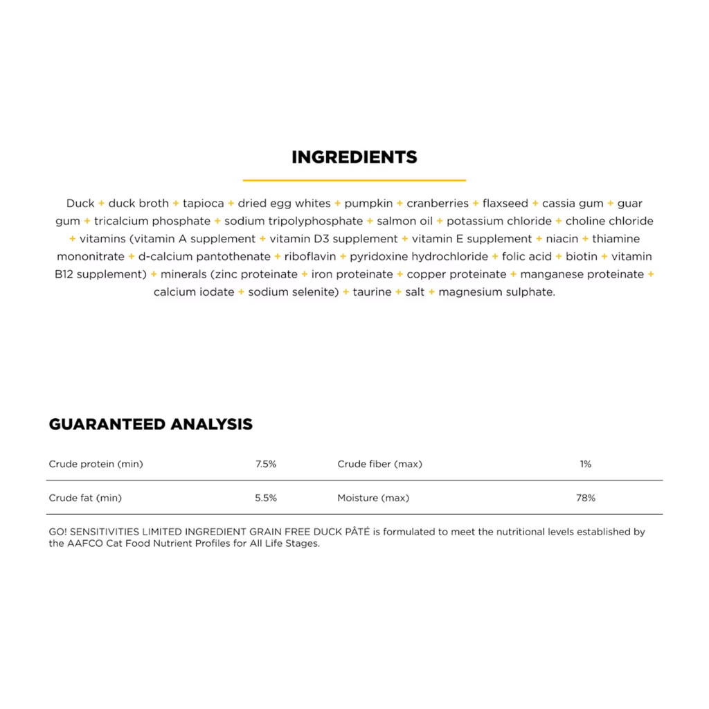 GO! SOLUTIONS SENSITIVITIES Limited Ingredient Grain-Free Duck Pâté is formulated to meet the nutritional levels established by the AAFCO Cat Food Nutrient Profiles for All Life Stages.