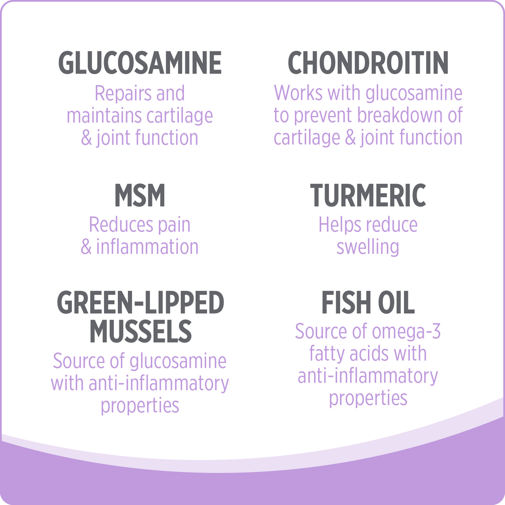 Active Ingredients: Glucosamine hydrochloride (shrimp), Methyl sulfonyl methane (MSM), chondroitin sulfate (porcine), perna canaliculus (green lipped mussel), curcuma longa (turmeric root), salmon oil.