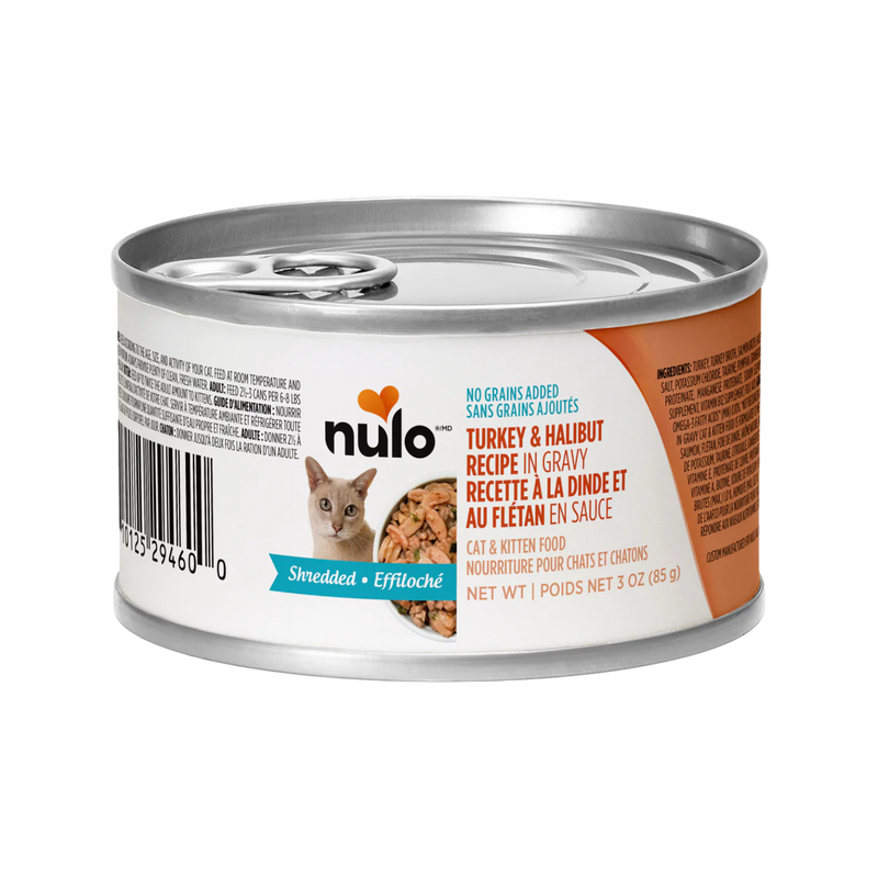Nulo shredded turkey & halibut recipe in gravy is formulated to meet the nutritional levels established by the AAFCO Cat Food Nutrient Profiles for all life stages.