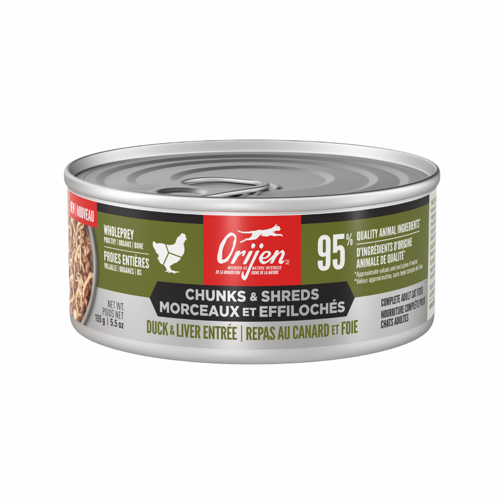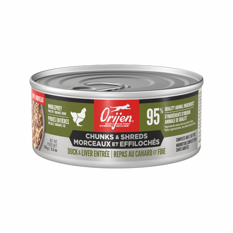 Nourish your cat completely with hearty WholePrey animal ingredients and real shreds of meat, poultry or fish in ORIJEN™ Chunks & Shreds Wet Cat Food! Cats are obligate carnivores, so they thrive off a diet packed with animal ingredients. That’s why our Duck & Liver Entrée recipe includes a whopping 95% animal ingredients1 to provide your cat with the Biologically Appropriate nourishment they were born to eat. This diet also includes succulent WholePrey ingredients like chicken liver to provide your cat with rich and varied nutrients. Bone broth helps support your cat’s hydration, while also adding tempting flavour. Nourish your cat with the texture and variety of raw animal ingredients packed into every can of ORIJEN™ Chunks & Shreds.