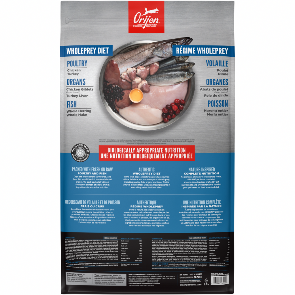 Help your dog thrive with the power of protein-rich recipes that provide peak nourishment. Dogs are ancestral carnivores, so they need a Biologically Appropriate diet rich and varied in whole animal ingredients. ORIJEN®Original diet is packed with 85%1quality animal ingredients like fresh or raw free-run2chicken and turkey, and wild-caught or sustainably farmed fish. Packed with WholePrey animal ingredients like organs and bone, ORIJEN food is made with the most nutrient-dense, succulent parts of the prey to deliver the nutrition dogs need. The result is a diet for your canine companion that is beyond comparison.