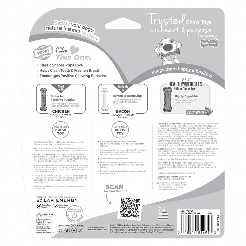 Get your puppy started on the right paw and develop healthy chewing habits from the start! The Puppy Starter Kit includes two puppy toys and an edible chew treat perfect for every developmental stage: a soft plastic Puppy Chew Bone for teething puppies before they get any permanent teeth; a Power Chew chicken-flavored bone for puppies starting to get their permanent teeth; and a Healthy Edibles bacon-flavored chew treat recommended for puppies 6 months and older. Each chew encourages proper chewing habits and helps discourage destructive chewing from a young age. Plus, they promote dental health by reducing plaque and tartar as your dog chews. You can feel good about rewarding your new best fur friend with these veterinarian- recommended puppy chew toys that are proudly made in the USA!