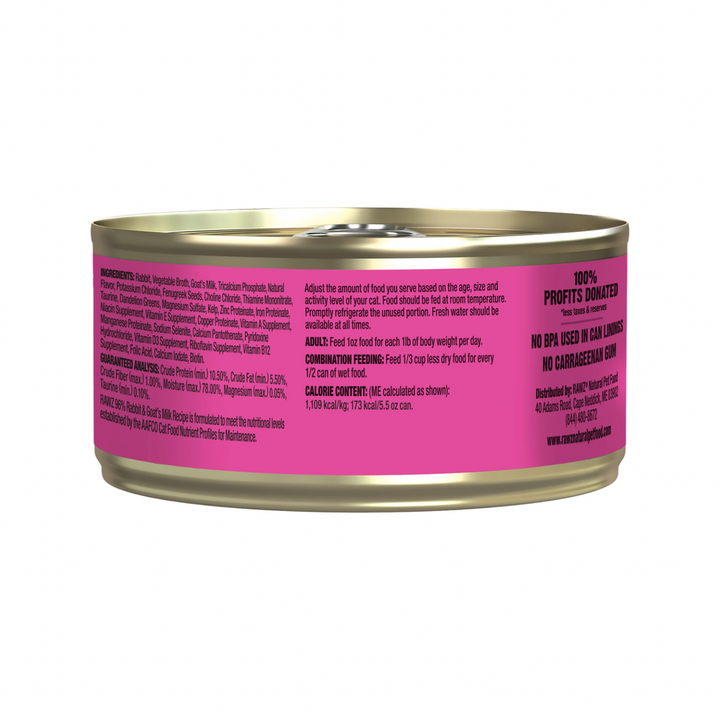 RAWZ® 96% Rabbit & Goat’s Milk Recipe has been formulated to meet the nutritional levels established by the AAFCO Cat Food Nutrient Profiles for Maintenance.