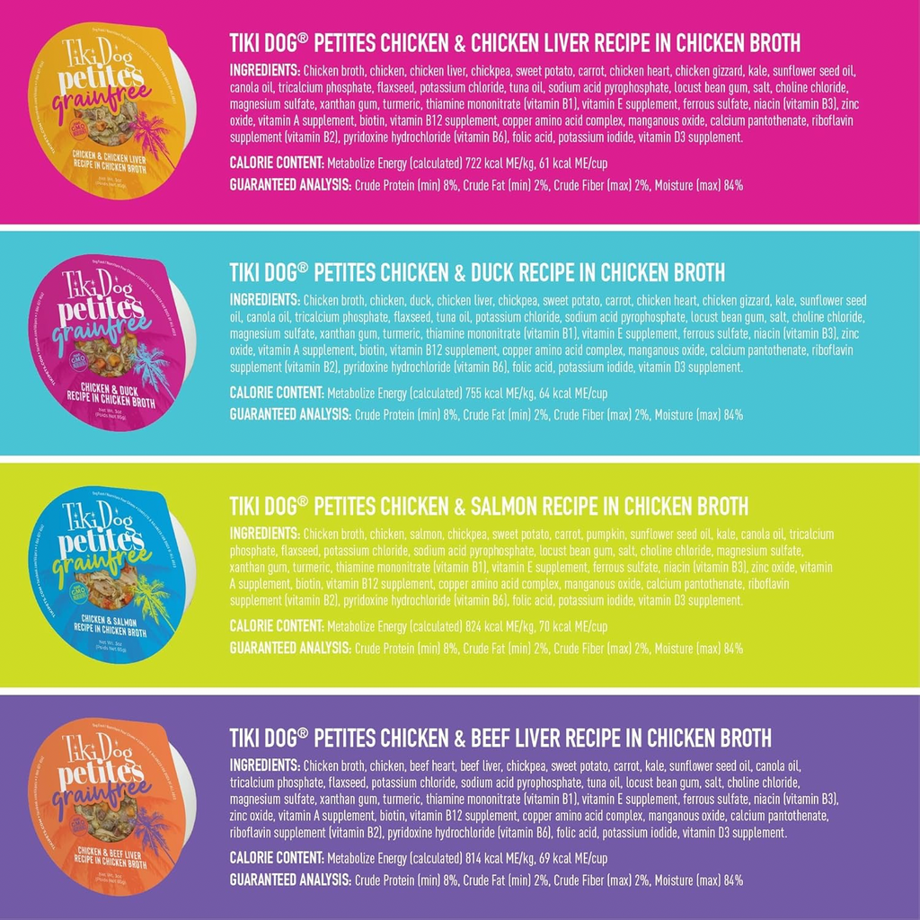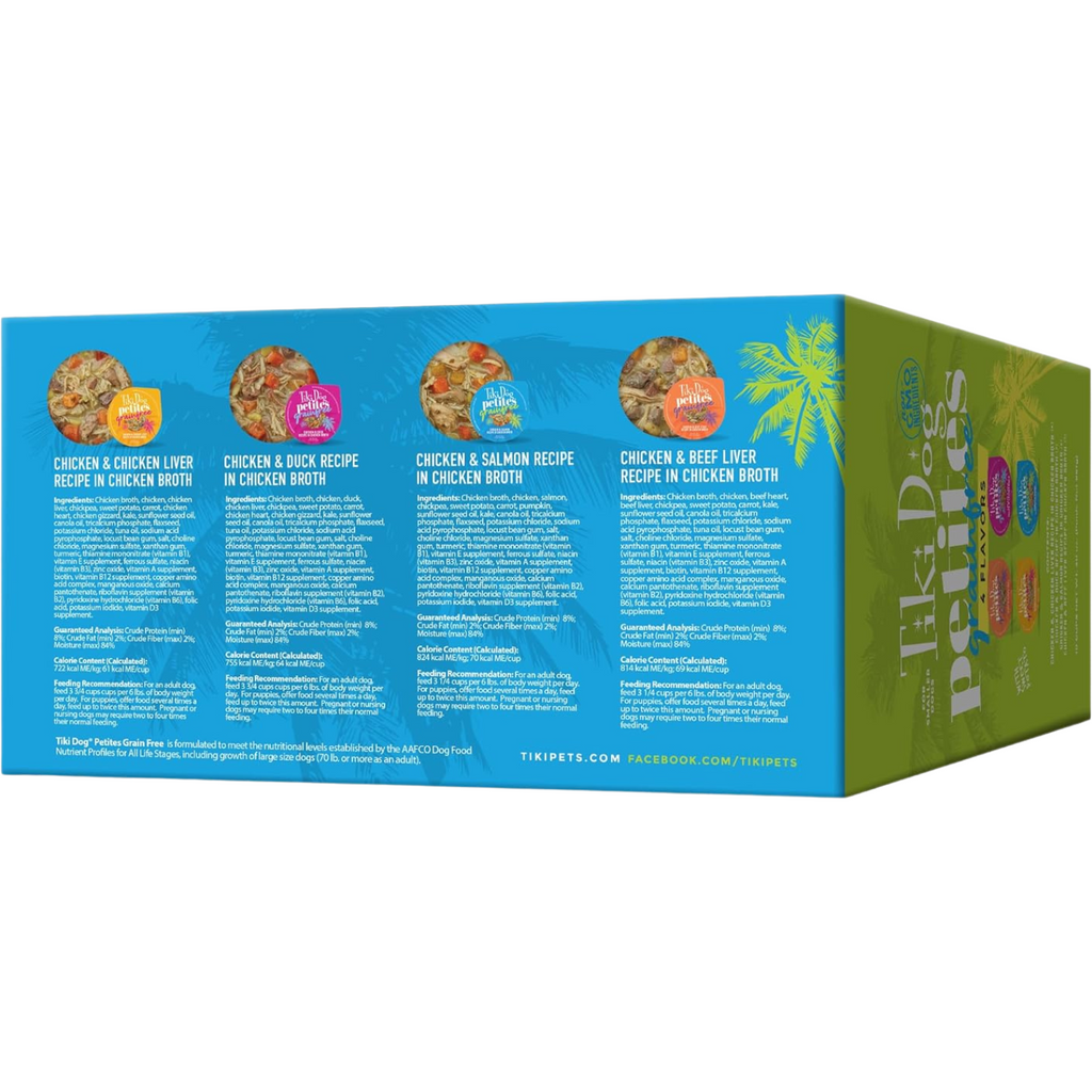 Tiki Dog® Petites Grain Free Wet Dog Food is a hearty meal with tender, shredded chicken and nutritious vegetables in a savory broth. Pure bliss with every bite.