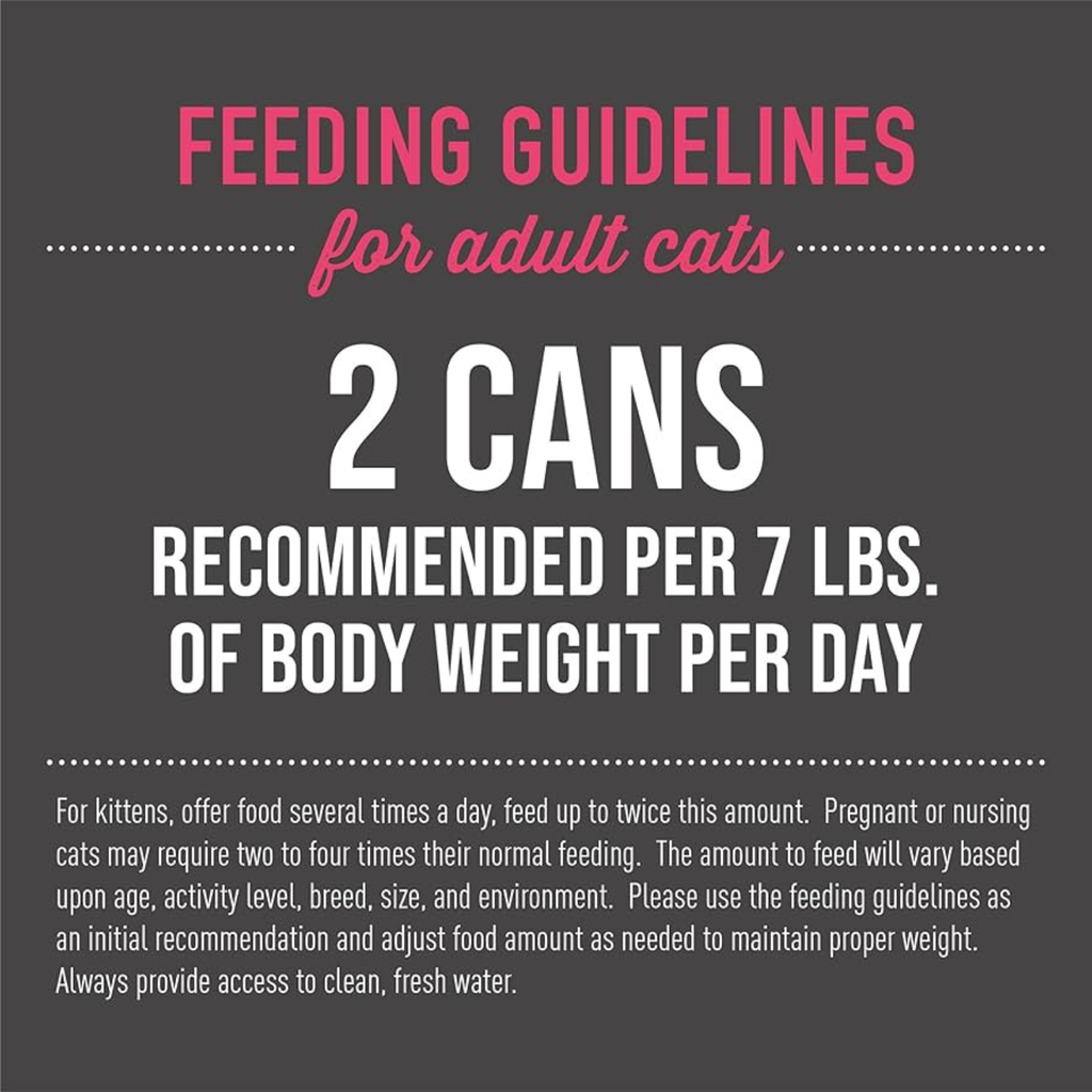 For adult cats, feed approximately 2 cans per day per 7 lbs. of body weight. For kittens, offer food several times a day, feed up to twice this amount. Pregnant or nursing cats may require two to four times their normal feeding. The amount to feed will vary based upon age, activity level, breed, size, and environment. Please use the feeding guidelines as an initial recommendation and adjust food amount as needed to maintain proper weight. Always provide access to clean, fresh water.