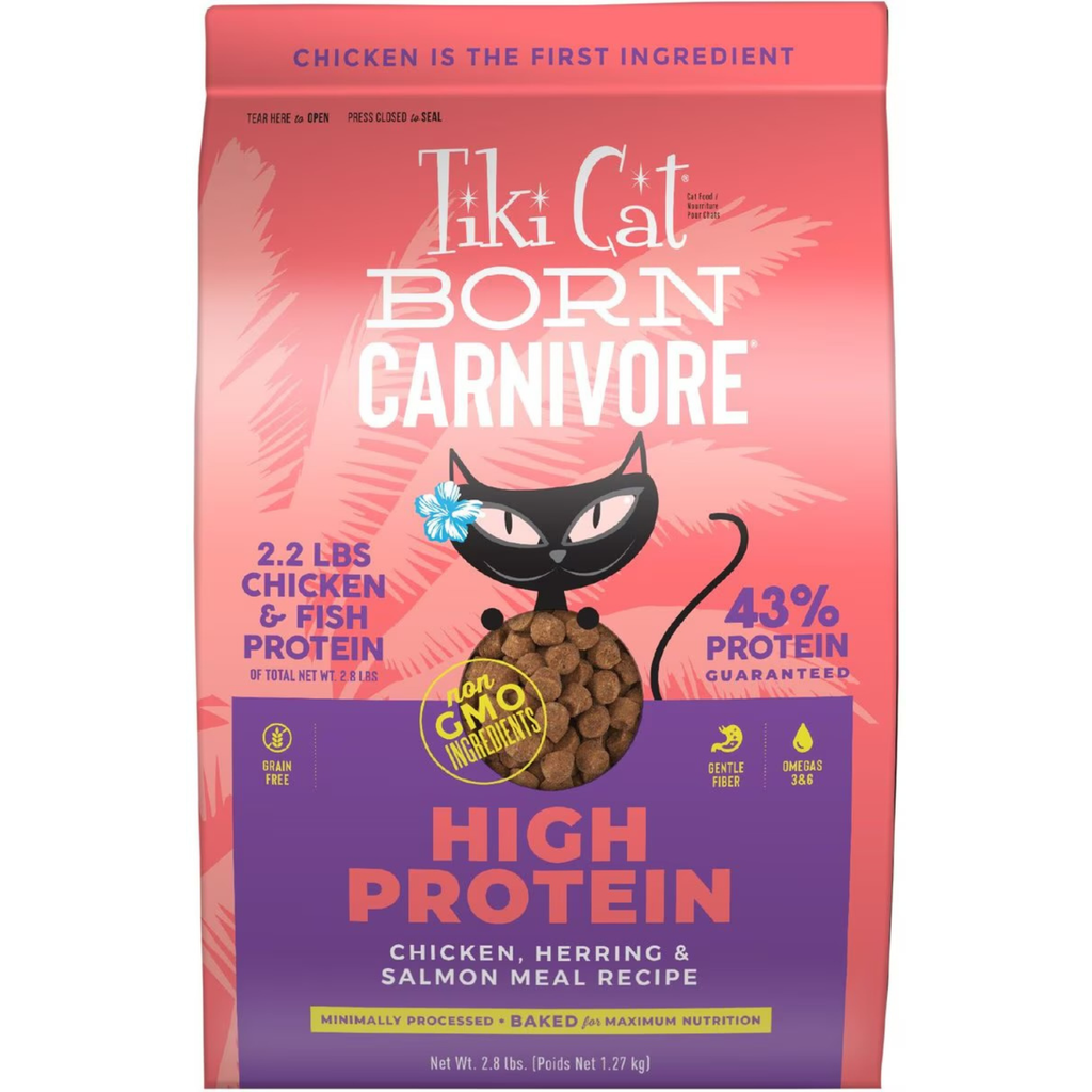 If feeding wet and dry food together, decrease the amount of Tiki Cat® Born Carnivore™ by approximately 1/8 cup for every small can (2.8 oz. or 3 oz.) can of Tiki Cat® wet food.