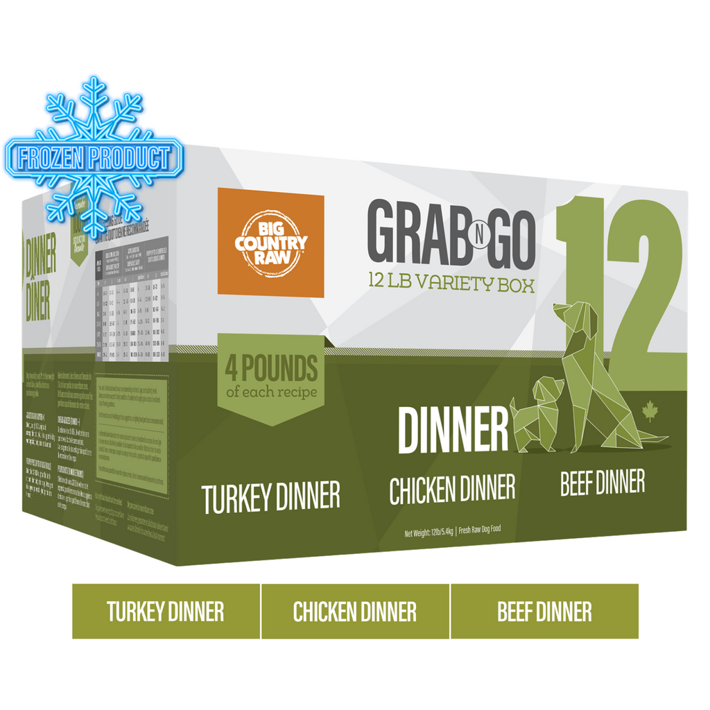 Contains 4lbs each: Chicken Dinner, Turkey Dinner and Beef Dinner