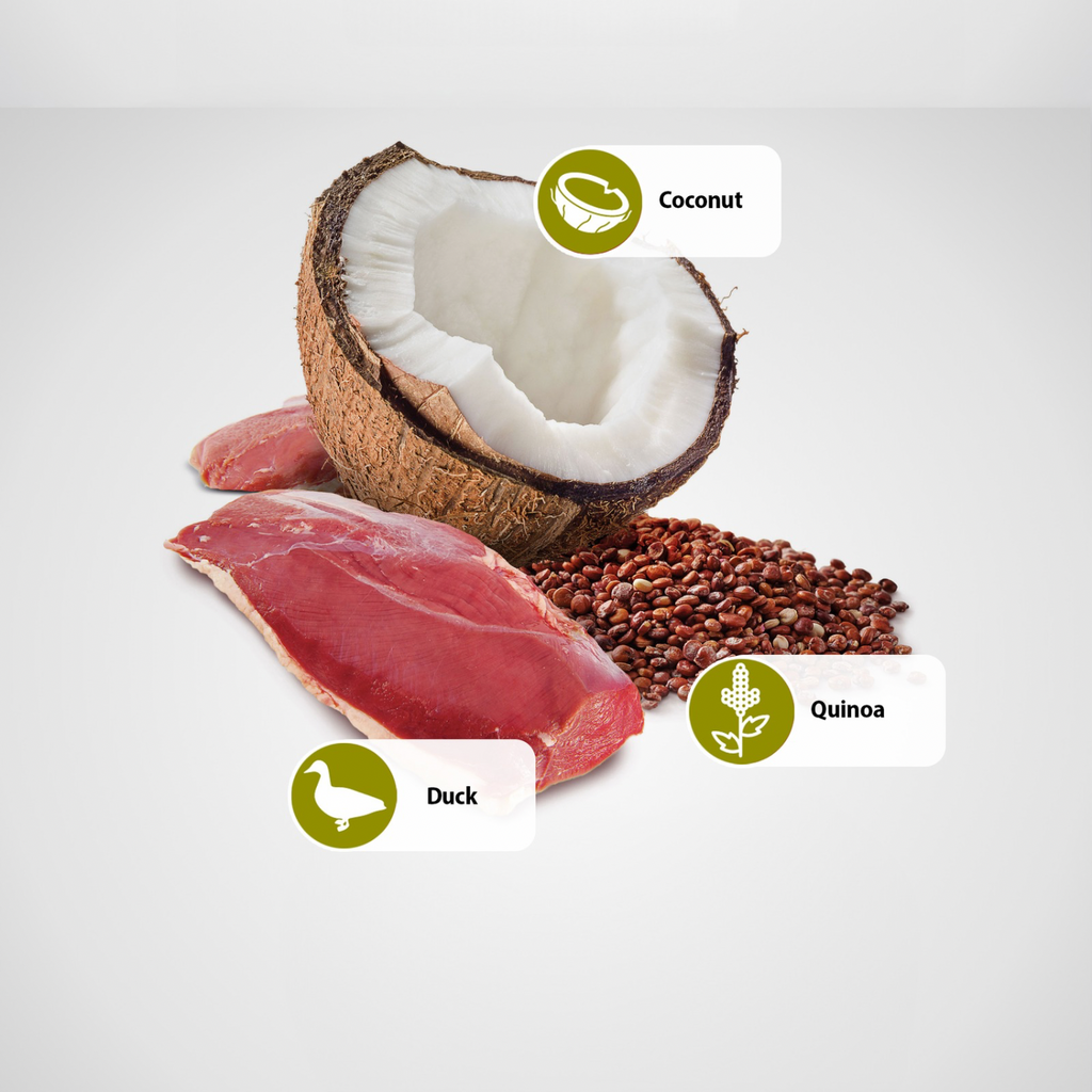 Duck, quinoa seed, herring oil, coconut, fructooligosaccharide, calcium carbonate, potassium chloride, chondroitin sulfate, glucosamine hydrochloride, vitamin A supplement, vitamin D3 supplement, vitamin E supplement, choline chloride, zinc methionine hydroxy analogue chelate, manganese methionine hydroxy analogue chelate, ferrous glycine complex, copper methionine hydroxy analogue chelate, selenium yeast, DL-methionine, taurine, L-Carnitine.