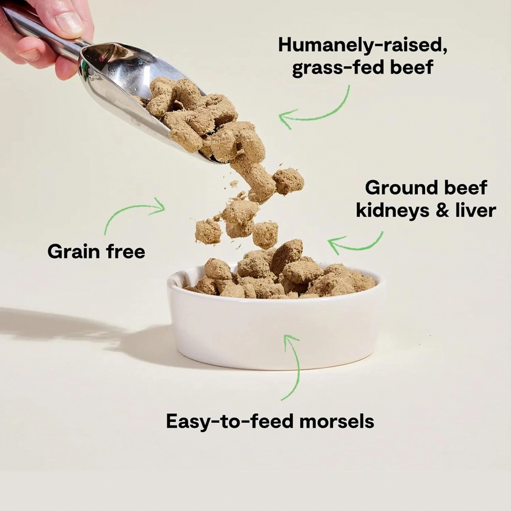 The benefits of pure raw nutrition meet the convenience of freeze dried in this single animal protein blend of 95% pasture-raised beef, organ, and bone. Finished with organic veggies and superfoods, these bite-sized morsels can be an irresistible complete and balanced meal or tasty meal-mixer that boosts their bowl with protein-packed nutrition!