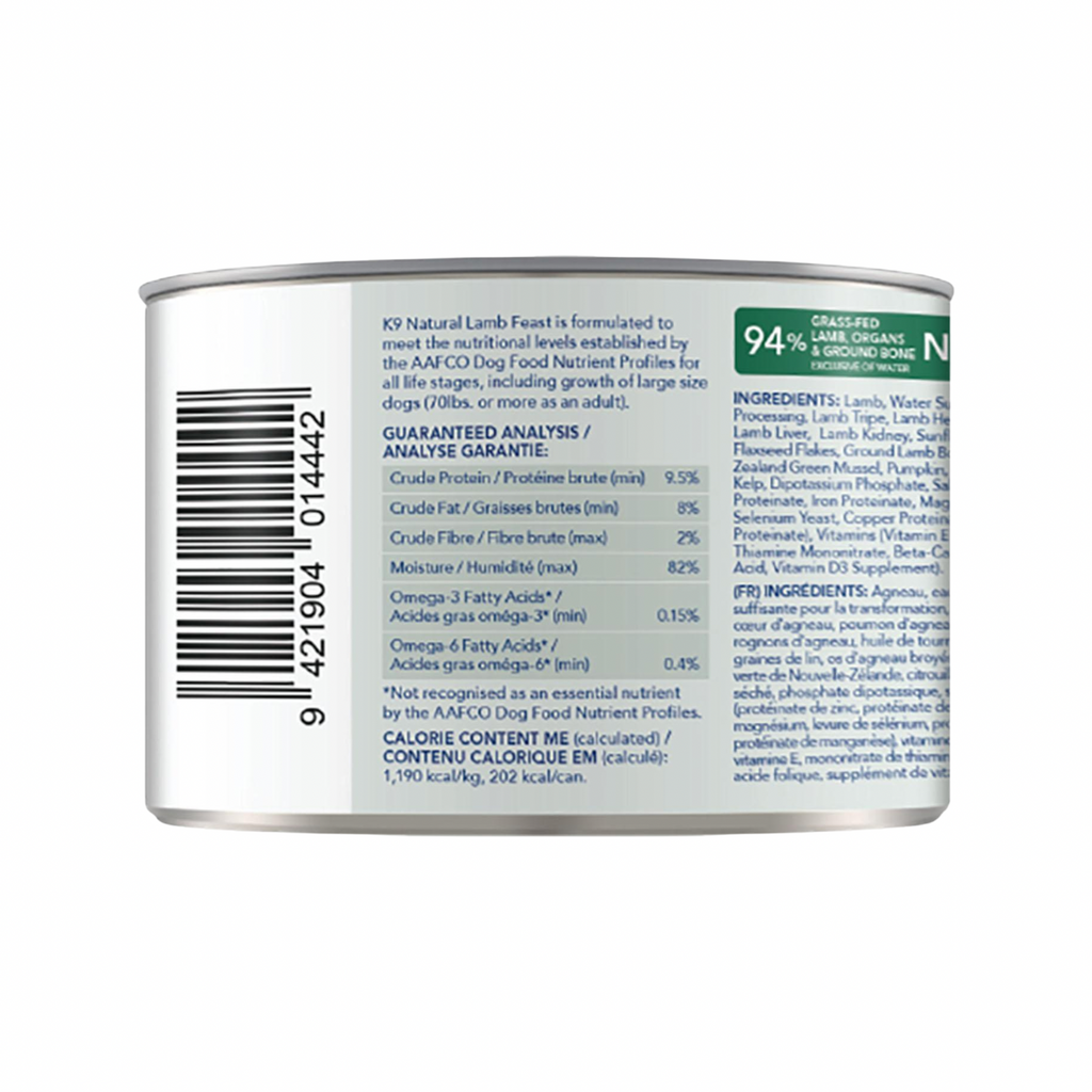Lamb, Water Sufficient for Processing, Lamb Liver, Lamb Heart, Lamb Tripe, Lamb Blood, Eggs, Lamb Spleen, Lamb Kidney, Ground Lamb Bone, Sunflower Oil, Flaxseed Flakes, Brown Kelp, New Zealand Green Mussel, Pumpkin, Broccoli, Cauliflower, Cabbage, Dipotassium Phosphate, Dried Kelp, Apples, Pears, Salt, Vitamin E Supplement, Zinc Proteinate, Iron Proteinate, Magnesium Oxide, Selenium Yeast, Copper Proteinate, Manganese Proteinate, Beta-Carotene, Thiamine Mononitrate, Vitamin D3 Supplement.
