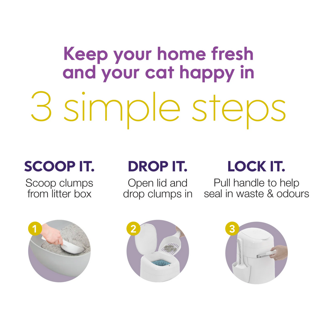 - SIMPLE TO USE – Enjoy a fresher home in just 3 easy steps: scoop clumps from the litter box, open the lid and drop them in, then pull the handle to lock away litter and odours