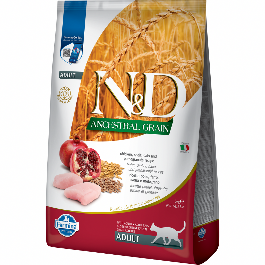 N&D Chicken, spelt, oats and pomegranate recipe is formulated to meet the nutritional levels established by the AAFCO Cat Food Nutrient Profiles for maintenance.