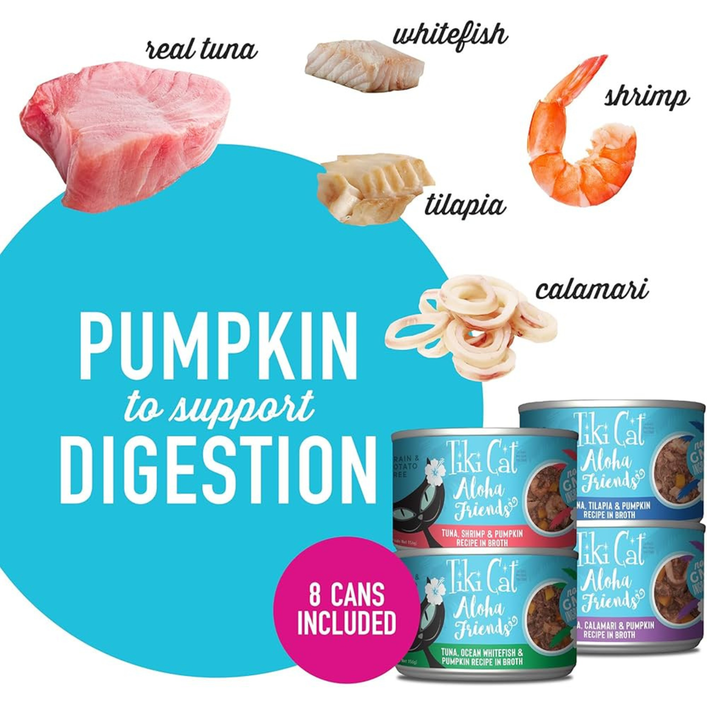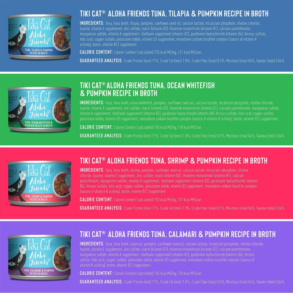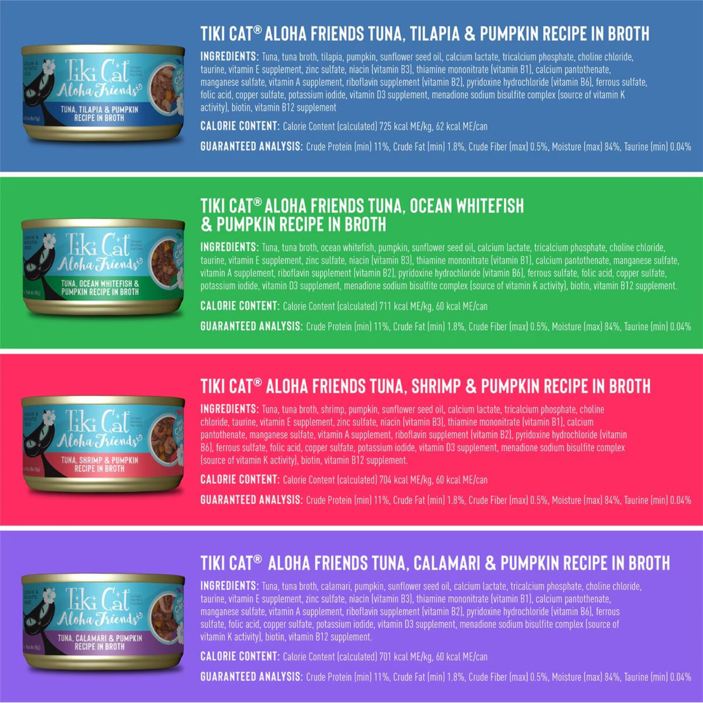 The Aloha Friends Variety Pack includes 3 each of: Tuna & Pumpkin Recipe in Broth, Tuna, Ocean Whitefish & Pumpkin Recipe in Broth, Tuna, Shrimp & Pumpkin Recipe in Broth, Tuna, Calamari & Pumpkin Recipe in Broth.