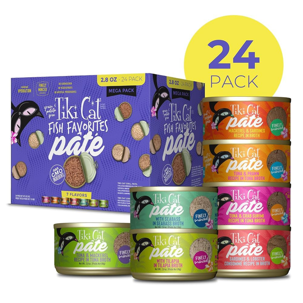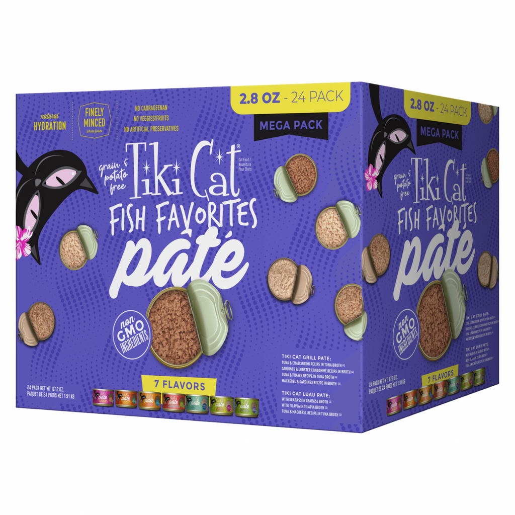 The ultimate variety pack for fish-loving cats who prefer pâtés! This mega pack is carefully curated with 24 servings of 7 delicious recipes that give cats what they biologically need as obligate carnivores: high protein from real animal sources, high moisture for supplemental hydration, and nutritional variety. Included are 4 Tiki Cat® Grill™ Pâté recipes with fish and shellfish, and 3 Tiki Cat® Luau™ Pâté recipes with high-quality fish. Treat your cat to a different fish pâté at every meal!