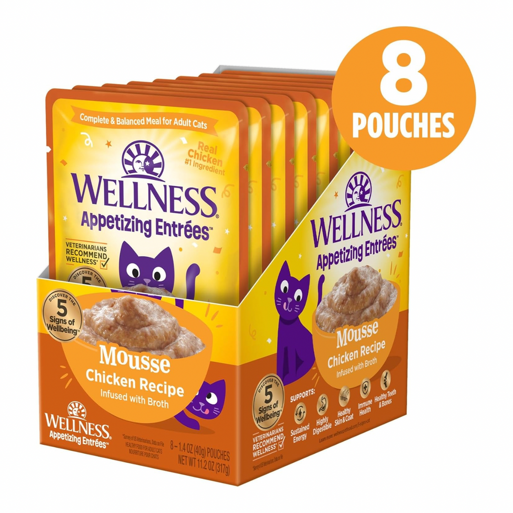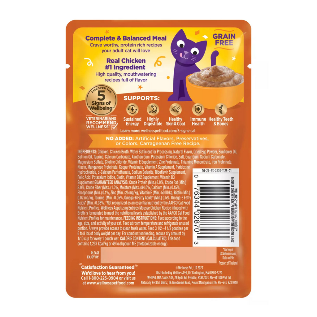 Wellness® Appetizing Entrées™ Mousse Chicken Recipe features mouthwatering meals cats crave. Each delicious, protein-rich recipe is formulated for adult cats, features real protein as the #1 ingredient, and is crafted with high-quality, natural* ingredients. Every pouch supports healthy hydration with moisture-rich broth and has no added artificial flavors, preservatives, colors, or Carrageenan. Mix & match between 9 mouth-watering recipes to support your cat’s daily nutrition. Your cat will crave these meals, Catisfaction Guaranteed. *with added vitamins, minerals & taurine.