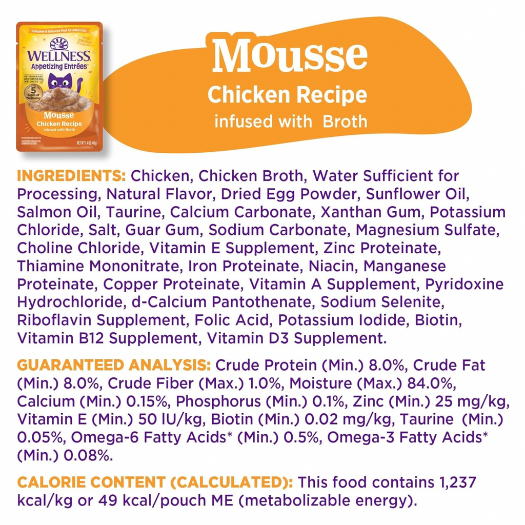 Wellness Appetizing Entrées Mousse Chicken Recipe Infused with Broth is formulated to meet the nutritional levels established by the AAFCO Cat Food Nutrient Profiles for maintenance.