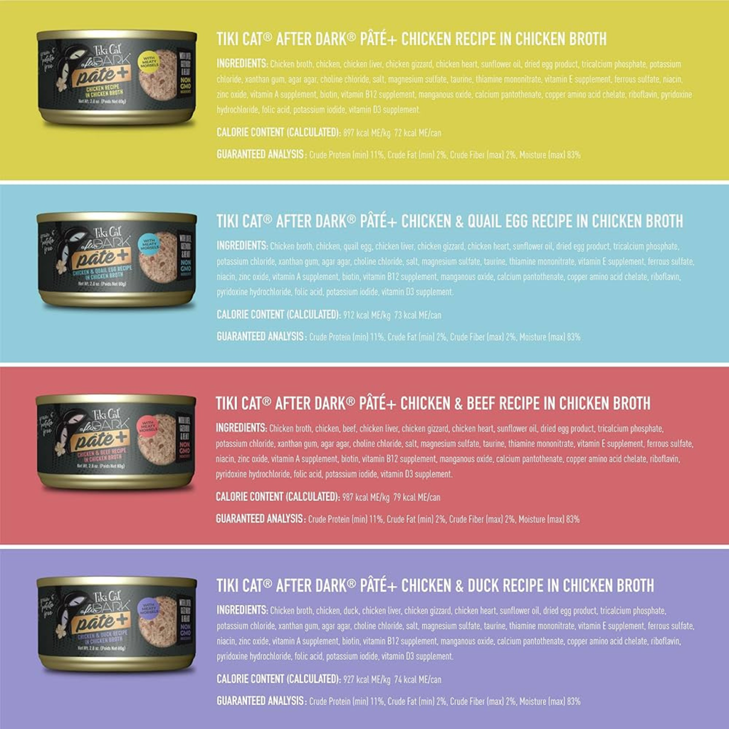 As obligate carnivores, cats have a natural instinct to hunt after dark and a nutritional need to eat meat. Tiki Cat® After Dark® Pâté+ is a meat-lover’s dream, closely mimicking cats’ natural prey diets. Real, finely minced chicken is combined with duck, beef, or quail egg - plus meaty morsels of organ meat - in savory broth for a soft, meaty meal cats love. Treat your carnivore cat to four favorite After Dark Pâté+ recipes in this exciting Variety Pack!