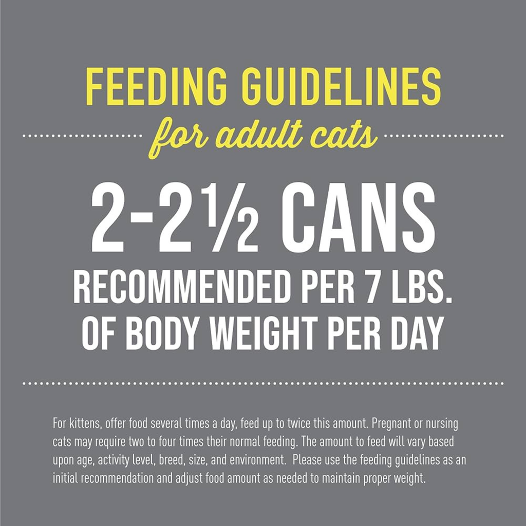 For adult cats, feed approximately 2 1/4 cans per day per 7 lbs. of body weight. For kittens, offer food several times a day, feed up to twice this amount. Pregnant or nursing cats may require two to four times their normal feeding. The amount to feed will vary based upon age, activity level, breed, size, and environment. Please use the feeding guidelines as an initial recommendation and adjust food amount as needed to maintain proper weight.