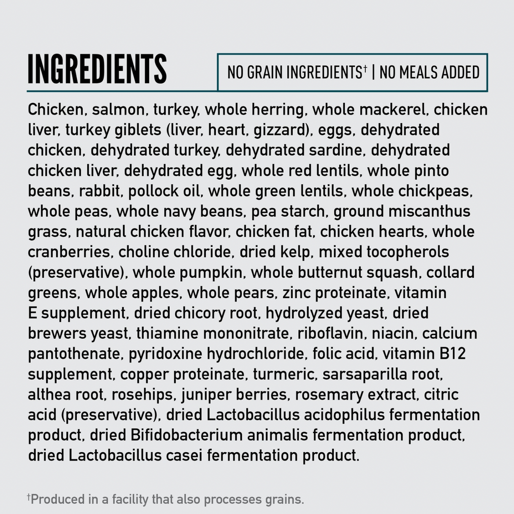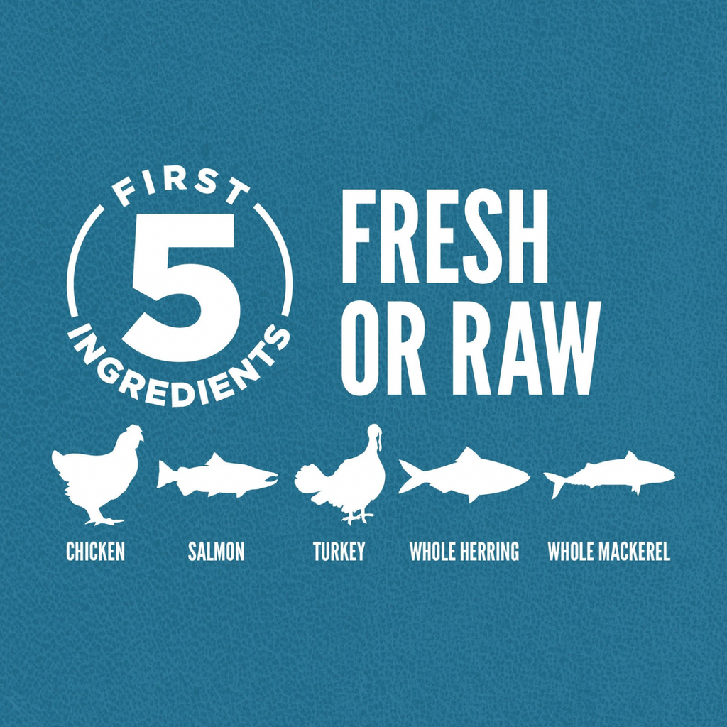 The first 5 ingredients are fresh or raw poultry and fish ingredients. Our fresh ingredients use refrigeration as the sole method of preservation and our raw ingredients are frozen at their peak freshness.