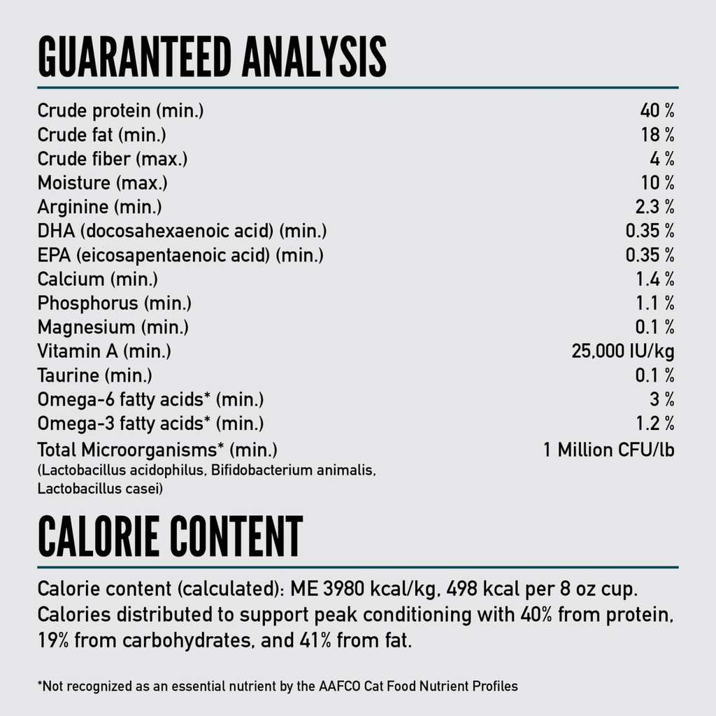 Metabolizable Energy is 3980 kcal/kg (498 kcal per 250ml/8 oz cup) with calories distributed to support peak conditioning; 40% from protein, 19% from vegetables and fruits, and 41% from fat.