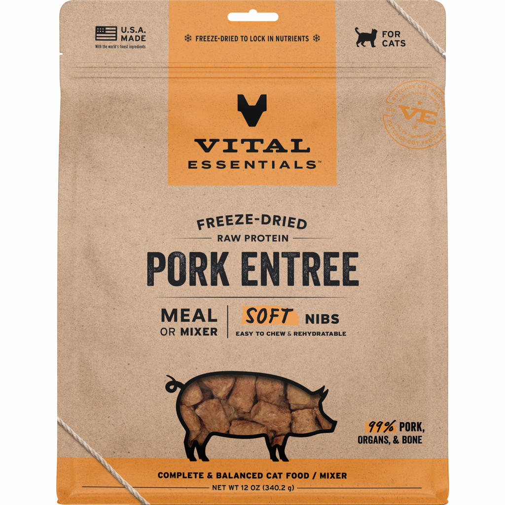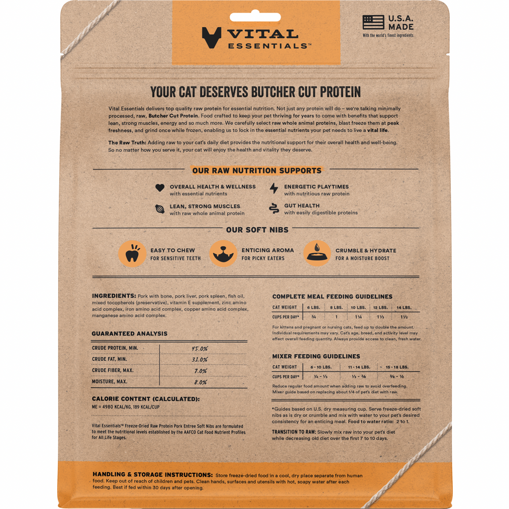 Vital Essentials® Freeze-Dried Raw Protein Pork Entree Soft Nibs are formulated to meet the nutritional levels established by the AAFCO Cat Food Nutrient Profiles for All Life Stages.