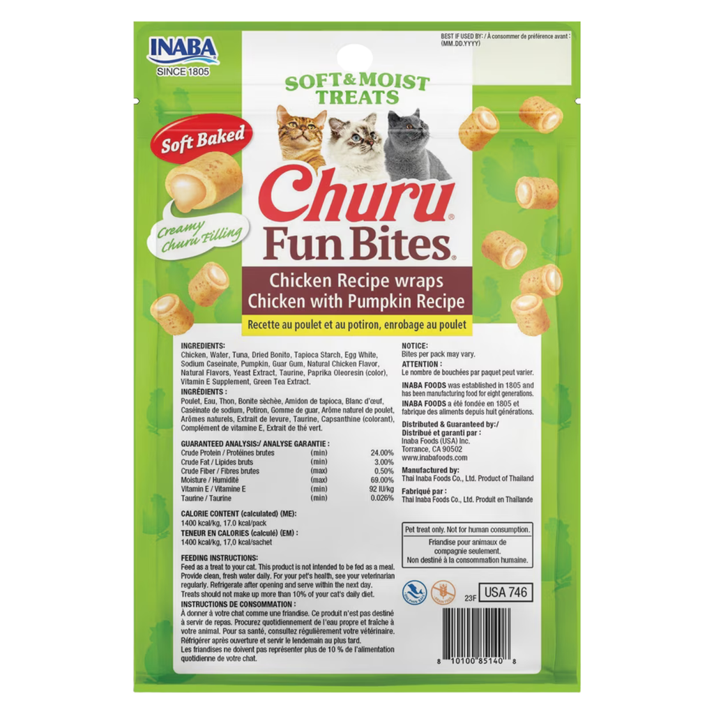 TWICE THE TEXTURE: Each pillow-shaped bite starts with a soft baked chicken paste with no grains, preservatives, carrageenan, or artificial colors. Then we've filled the centers with Inaba's delicious Churu filling to give your cat twice the texture