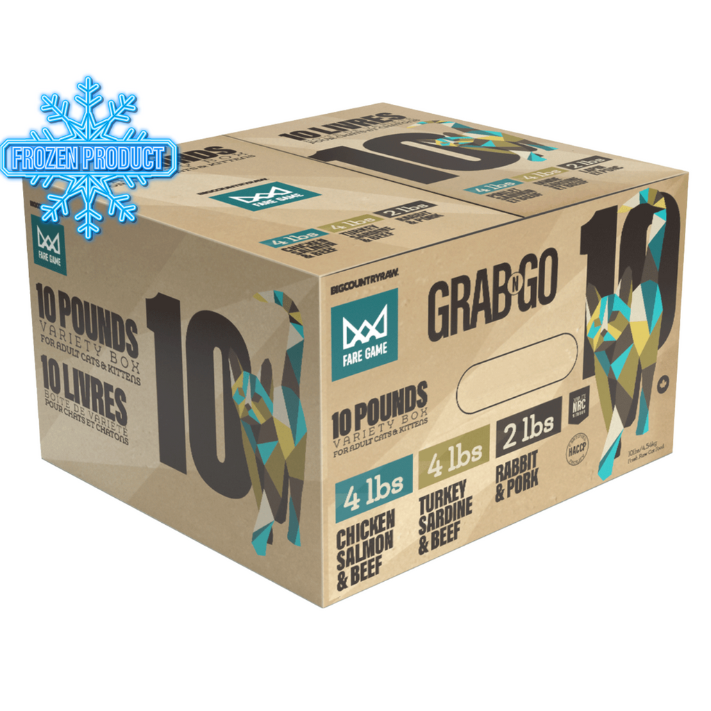 Each box contains 4 lbs Chicken Salmon & Beef, 4 lbs Turkey Sardine & Beef, and 2 lbs Rabbit & Pork.