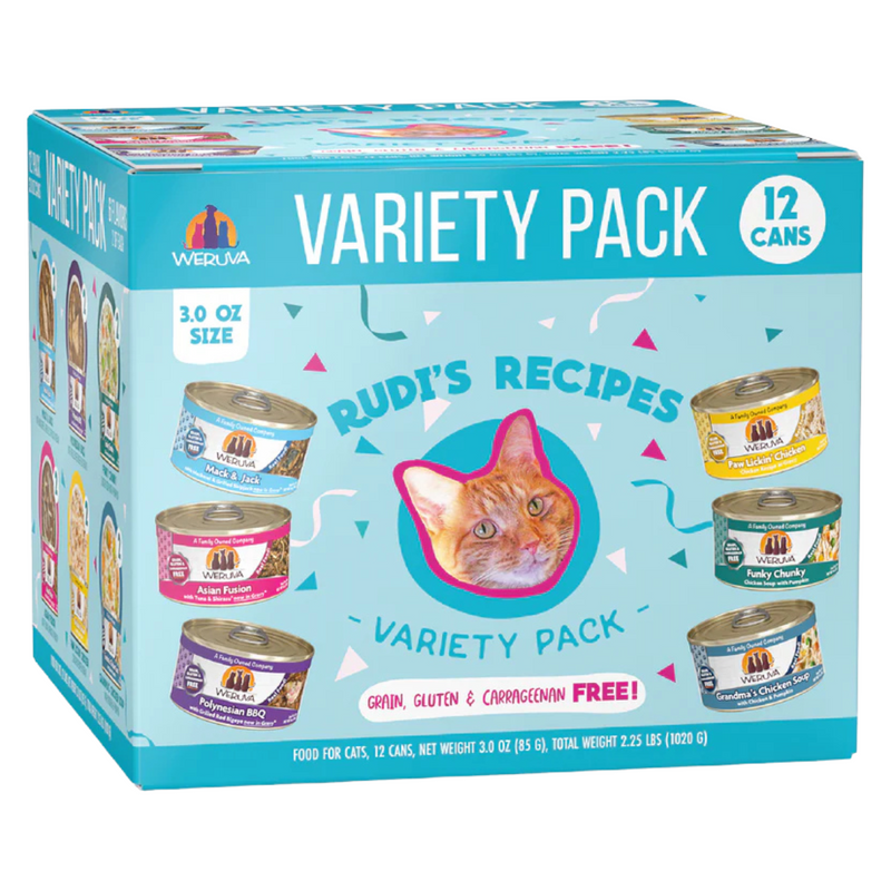 Le pack de variétés Rudi Recipes 3,0 oz comprend les saveurs suivantes: Mack et Jack, barbecue polynésien, Funky Chunky, Fusion asiatique, Paw Lickin 'Chicken and Grandm’s Chicken Soup