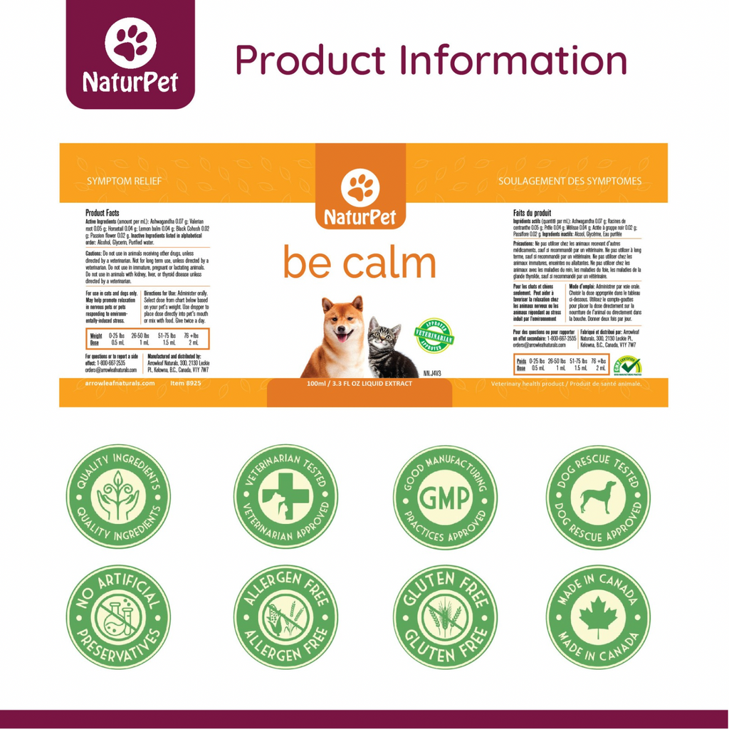 Anciennement appelé à la maison seule, Naturpet Soyez calme est un remède à base de plantes entièrement naturel pour des animaux anxieux ou stressés contenant de l'ashwagandha, de la racine de la valériane, de la prêle de sortie, de la cohosh noire, du baume au citron et de la passion. Il réduit l'anxiété, le stress, la tension musculaire, les palpitations cardiaques et abaisse la pression artérielle.