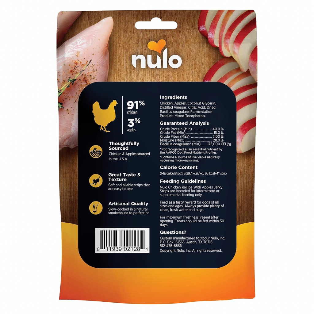 Nulo Jerky Strips chicken with apples recipe is intended for intermittent or supplemental feeding only.