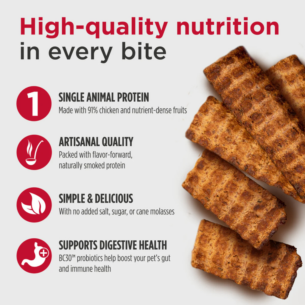 Our portable chicken jerky strips fuel every trail run, training session, and spontaneous adventure. The real apple pieces add natural sweetness while probiotics keep your dog’s digestive tract running smoothly. The soft strips tear easily for quick rewards that won't slow you down, keeping you stocked with adventure-ready nutrition.