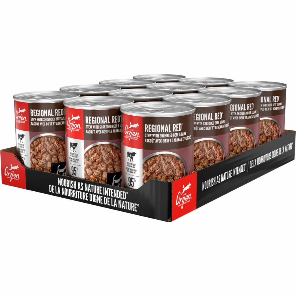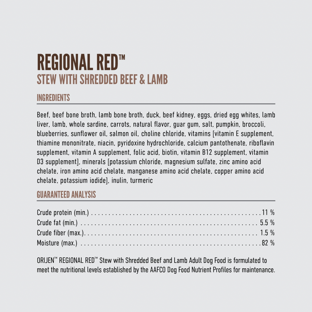 Orijen® Regional Red Stew Dog Food est formulé pour répondre aux niveaux nutritionnels établis par les profils de nutriments alimentaires pour chiens AAFCO pour l'entretien.