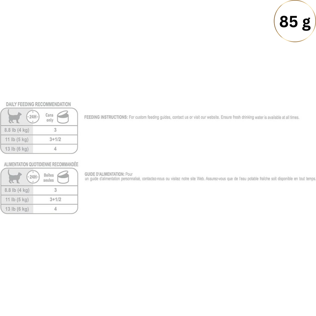 Water sufficient for processing, pork by-products, chicken by-products, pork liver, chicken, wheat flour, wheat gluten, modified corn starch, powdered cellulose, pork plasma, natural flavors, calcium sulfate, potassium chloride, carob bean gum, taurine , des vitamines [acétate de tocophérol DL-alpha (source de vitamine E), du L-Ascorbyl-2-polyphosphate (source de vitamine C), du mononitrate de thiamine (vitamine B1), du supplément de niacine, de la biotine, de la vitamine D-calcium B6), supplément de riboflavine, acide folique, supplément de vitamine B12, supplément de vitamine D3], tripolyphosphate de sodium, chlorure de choline, sel, carbonate de sodium, extrait de soucis (Tagètes érecta L.), trace minéraux [protéiné du zinc, oxyde de zinc, sulfate ferreux, sulfate de cuivre, oxyde de manganous, sélénite de sodium, iodate de calcium].