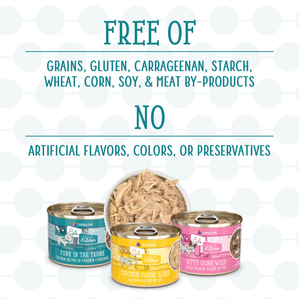 Le pack de variétés de mignonnes de cuisine comprend 3 chacun de: Poulet Frick ‘A Zee, Kitty Gone Wild, Funk in the Trunk et Lamb Burger-ini.