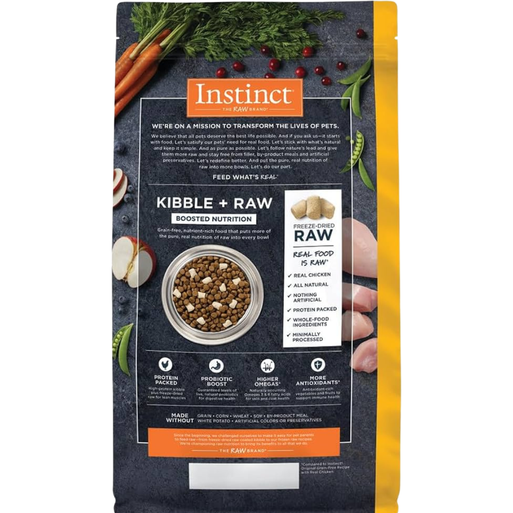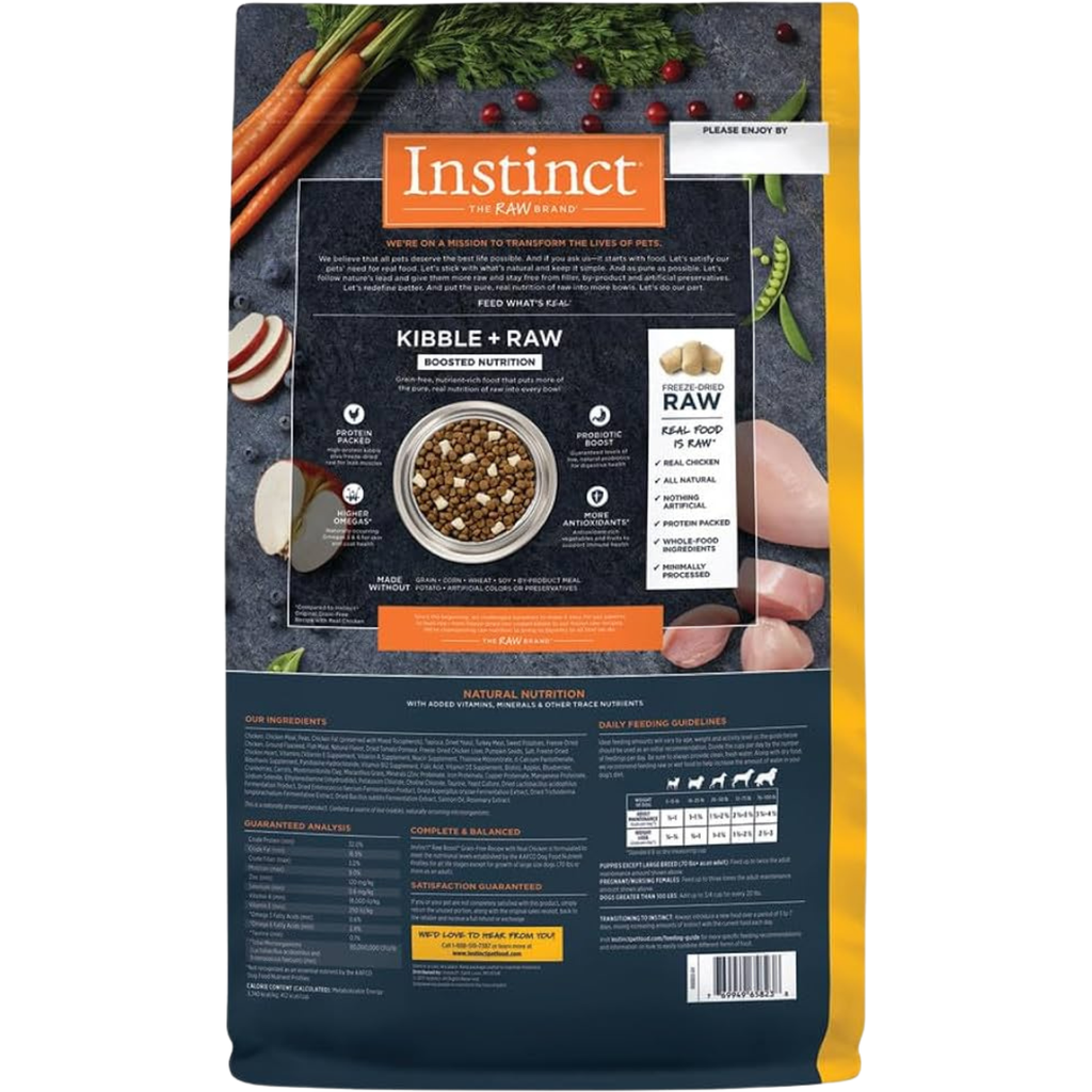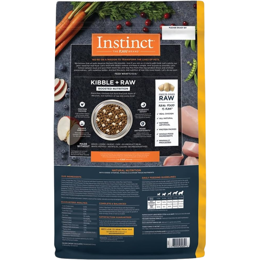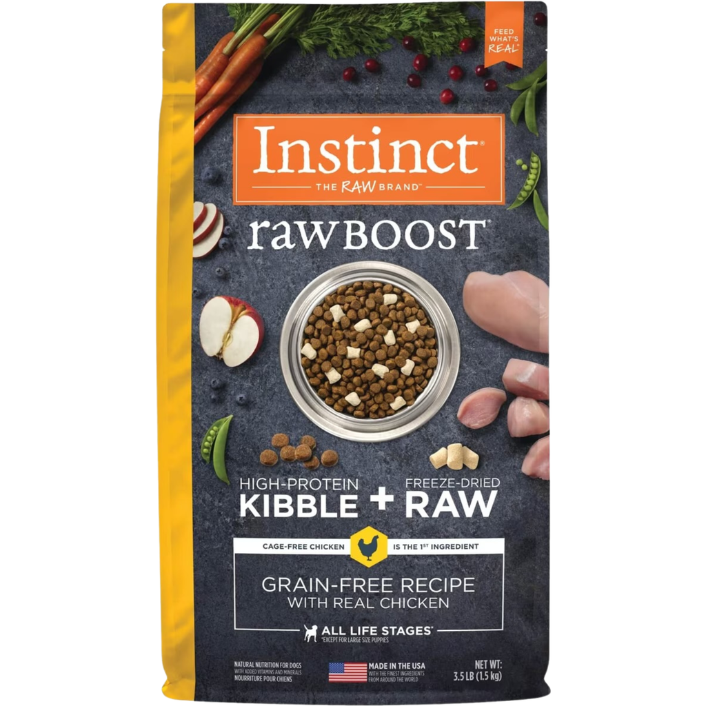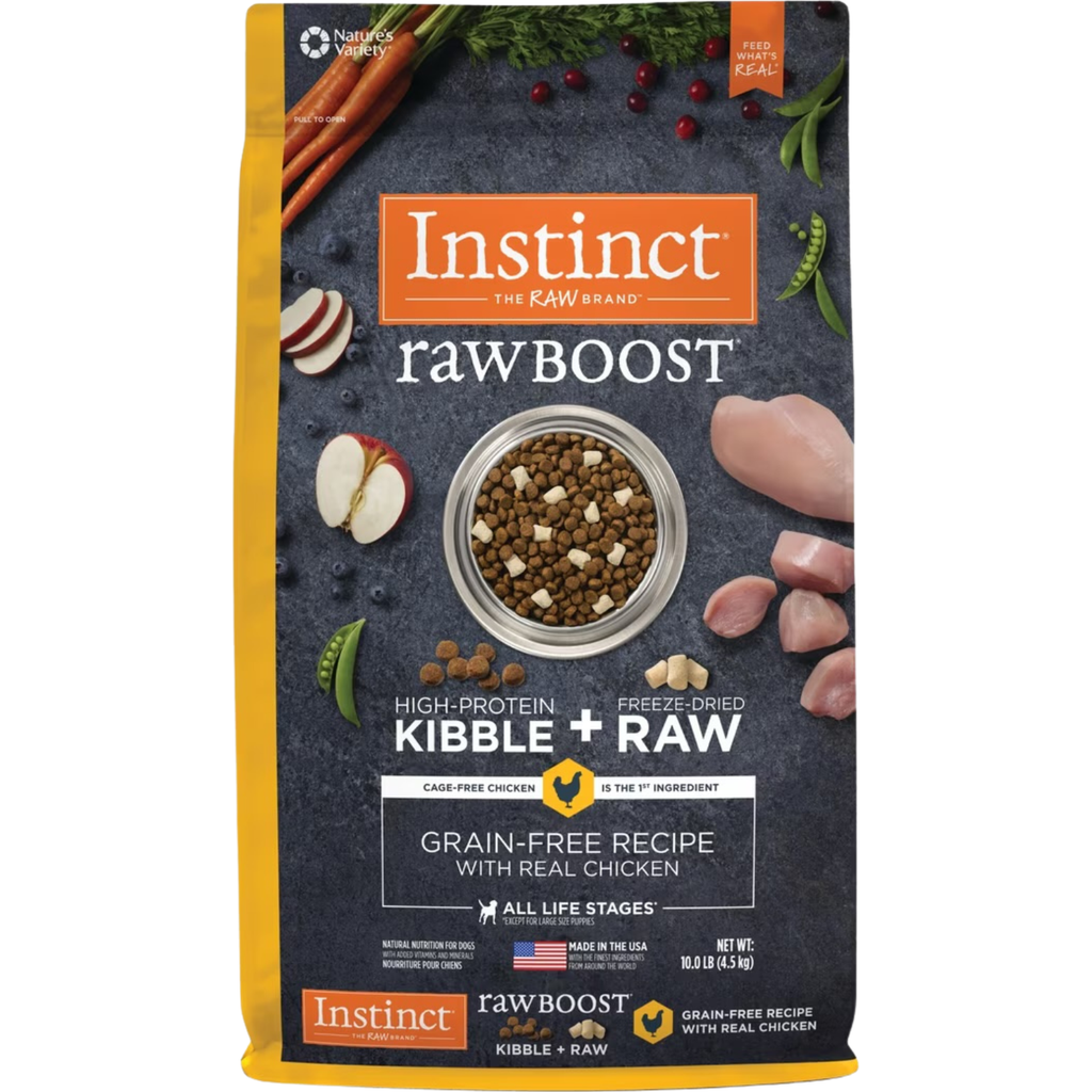 Instinct Raw Boost Recepe sans céréales avec du vrai poulet est formulé pour atteindre les niveaux nutritionnels établis par les profils de nutriments alimentaires pour chiens AAFCO pour toutes les étapes de la vie, à l'exception de la croissance de chiens de grande taille (70 lb ou plus à l'âge adulte).