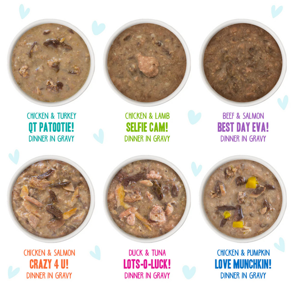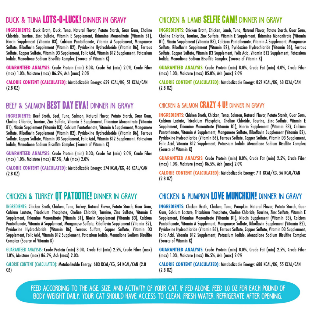 Préparez-vous pour votre chat de faire l'expérience d'un arc-en-ciel de saveurs! Le pack de variété Rainbow Road comprend deux chacun de vos préférées de votre Kitty. OMG! Saveurs: poulet et citrouille amour munchkin!, poulet et saumon fou 4 u !, Poulet et turquie Qt Patootie!, Cam de poulet et d'agneau Selfie Cam !, Duck & thon lots-o-chance! et le meilleur jour de la bœuf et du saumon Eva!