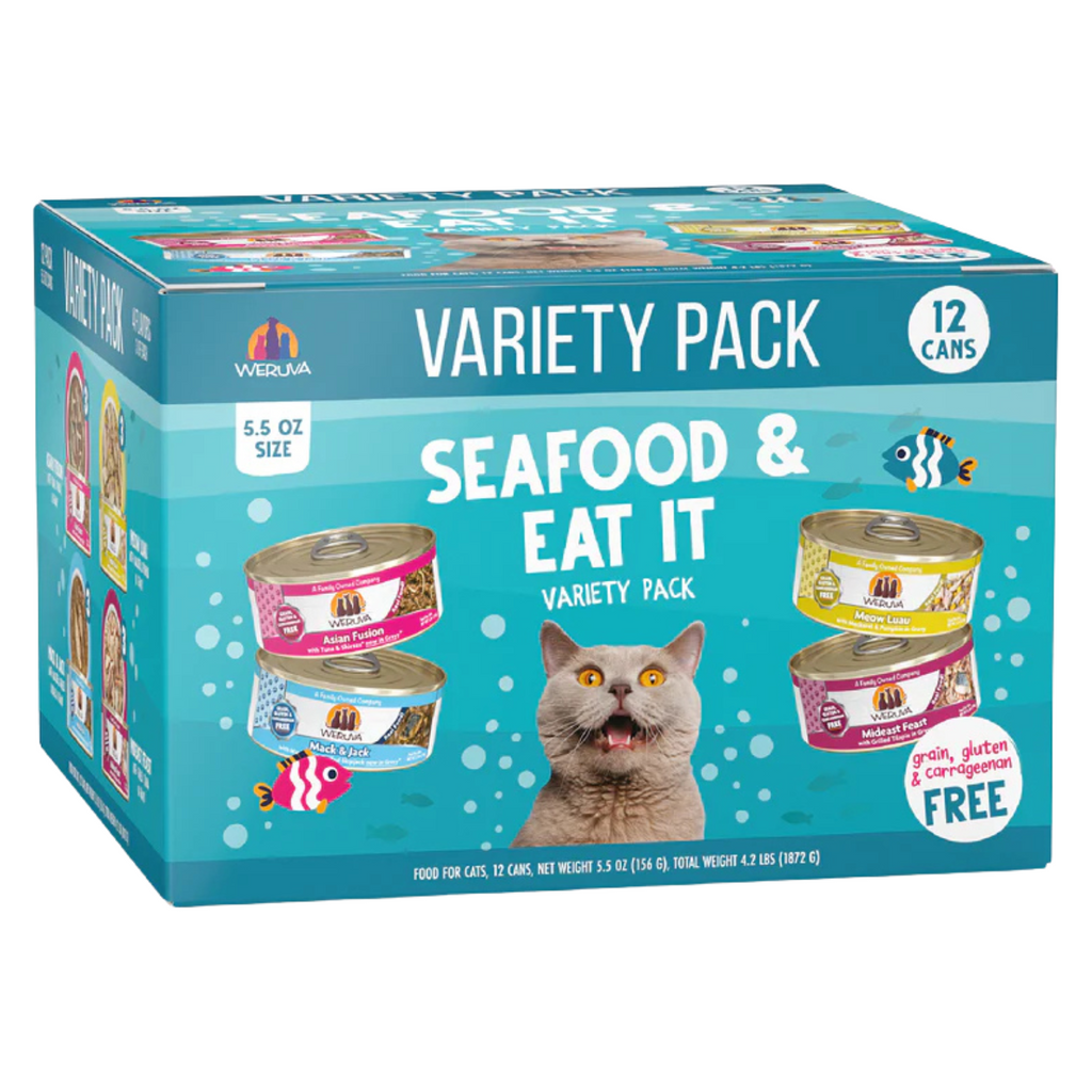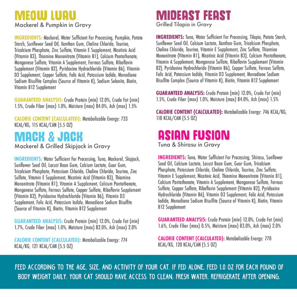 - Features a seafood assortment of Weruva Classic recipes recipes like Asian Fusion, Mack & Jack, Meow Luau, and Mideast Feast.
