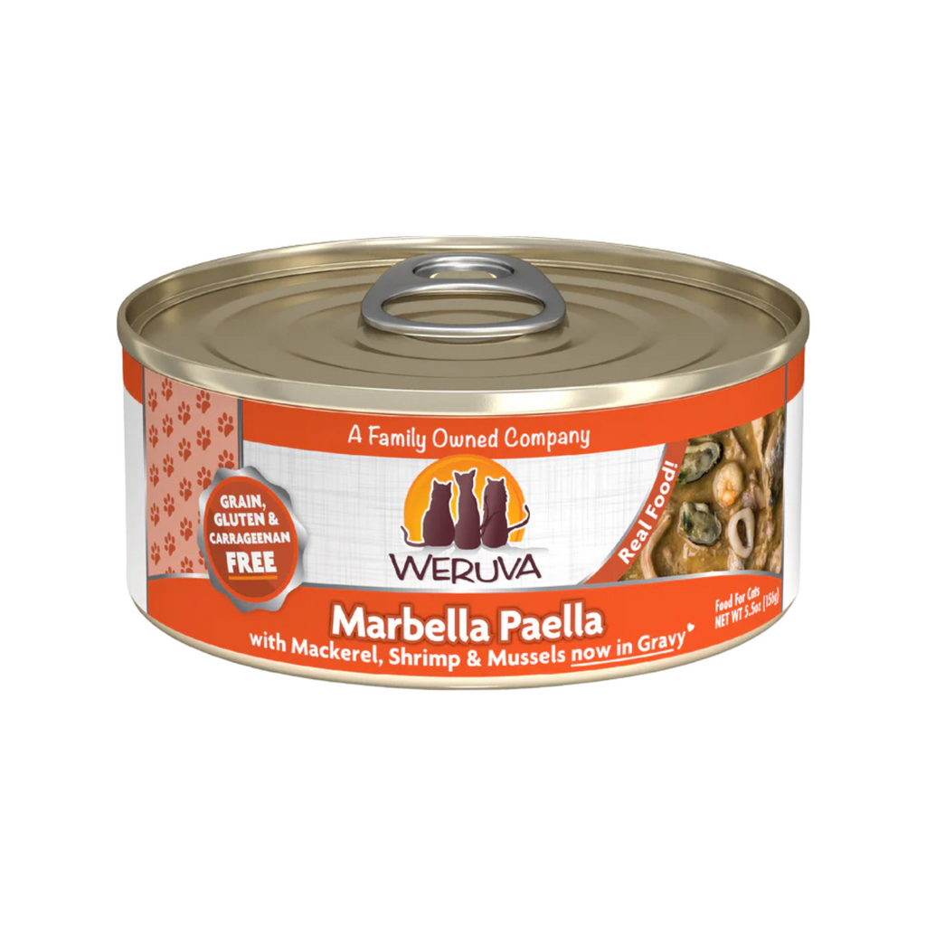 A note about carrageenan: We’ve listened to your valuable feedback and made a small change to Marbella Paella by removing carrageenan! By simply removing carrageenan, it results in a texture change, making the food more gravy-like, though we have not added any water. Here’s how it works – carrageenan is a common food ingredient that helps thicken and stabilize foods for people and pets, and it helped to make the "aspic" texture in our previous recipes (aspic is the gel-like substance that binds the food and protects it, much like fruit in a Jello mold). The ingredients in aspic were carrageenan and vegetable gums, which start off as a powder, but when mixed with water and cooked take on a gel-like texture like Jello. With carrageenan removed and water content unchanged in our new recipes, the gel no longer forms, and the result is instead a gravy. As cooked fish is a bit delicate and flaky, you may find the pieces in gravy flake a bit before they get to you. If you can't bring your cat to Spain, bring Spain to your cat! Rich in Omega-3s, let kitty enjoy a paella mix of mackerel flakes, whole calamari, baby shrimp and mussels. Everything but the kitchen sink. Fabulosa!