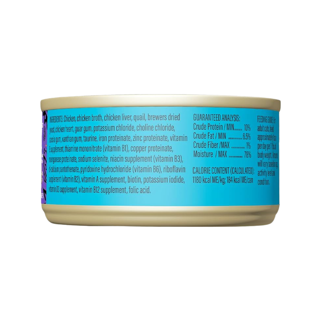 Chicken, chicken broth, chicken liver, quail, brewers dried yeast, chicken heart, guar gum, potassium chloride, choline chloride, cassia gum, xanthan gum, taurine, iron proteinate, zinc proteinate, vitamin E supplement, thiamine mononitrate (vitamin B1), copper proteinate, manganese proteinate, sodium selenite, niacin supplement (vitamin B3), d-calcium pantothenate, pyridoxine hydrochloride (vitamin B6), riboflavin supplement (vitamin B2), vitamin A supplement, biotin, potassium iodide, vitamin D3 supplement, vitamin B12 supplement, folic acid.