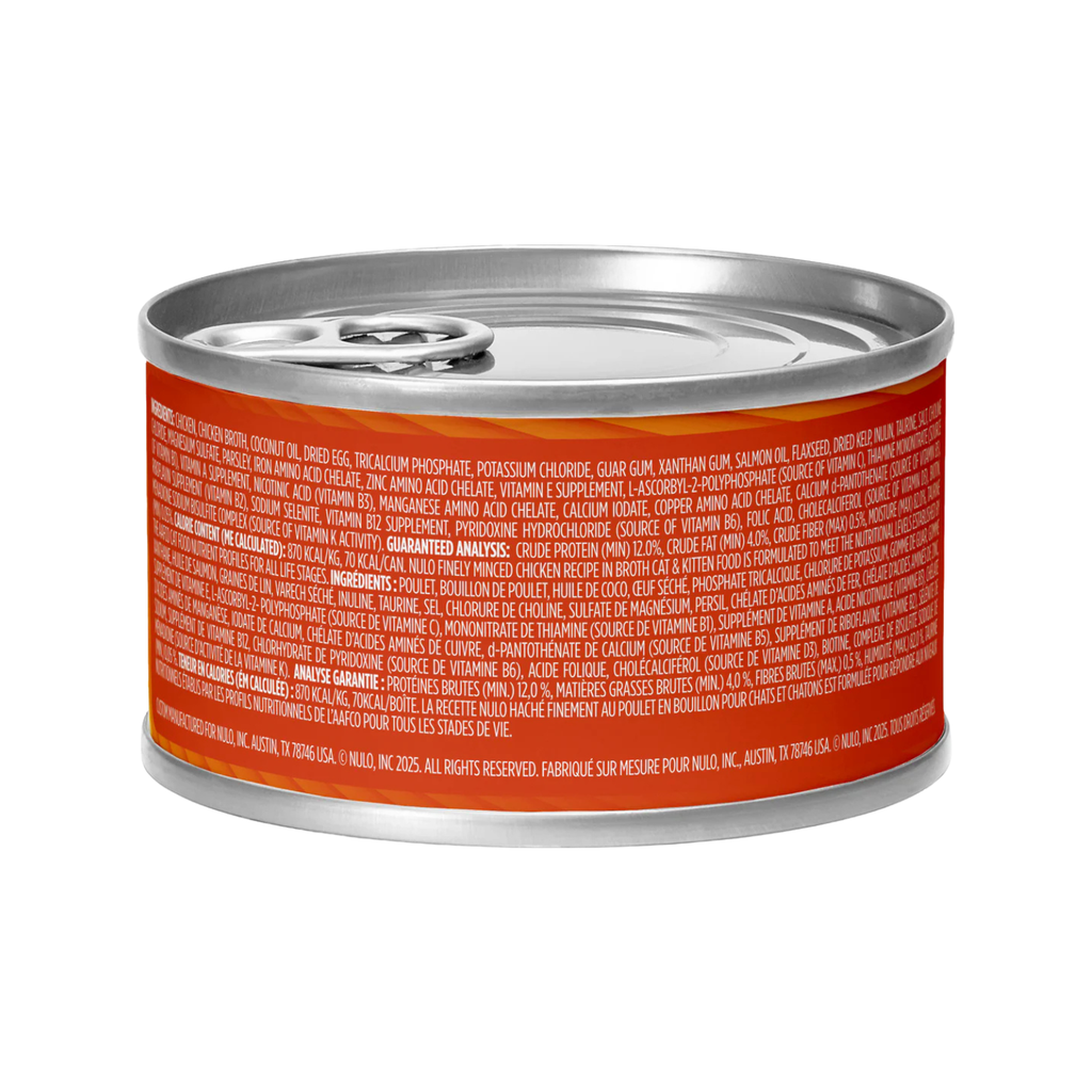 Nulo Finely Minced Chicken Recipe in Broth Cat & Kitten Food is formulated to meet the nutritional levels established by the AAFCO Cat Food Nutrient Profiles for all life stages.