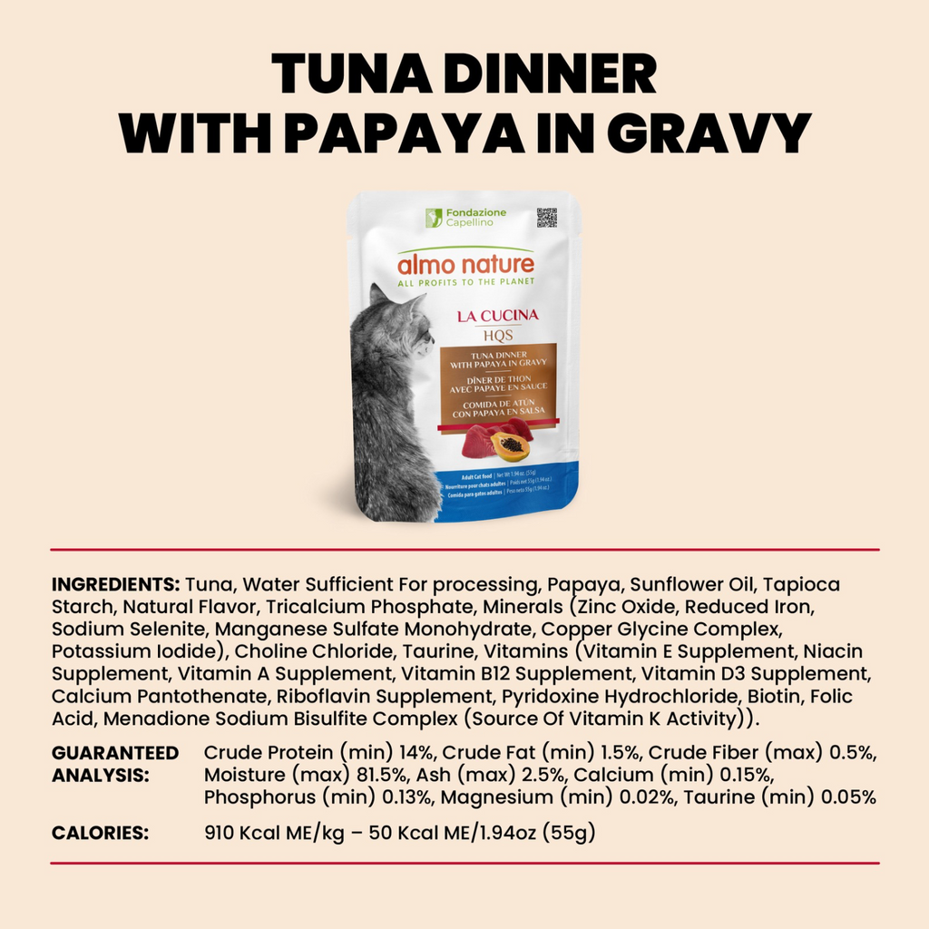 Bring a tropical twist to your cat’s mealtime with La Cucina HQS Tuna Dinner with Papaya in Gravy—a high-protein wet cat food made with real tuna and naturally sweet papaya in a savory gravy. Perfect for adult cats aged 1+ and seniors 7+, this recipe delivers hydration, flavor, and essential nutrients in every bite.