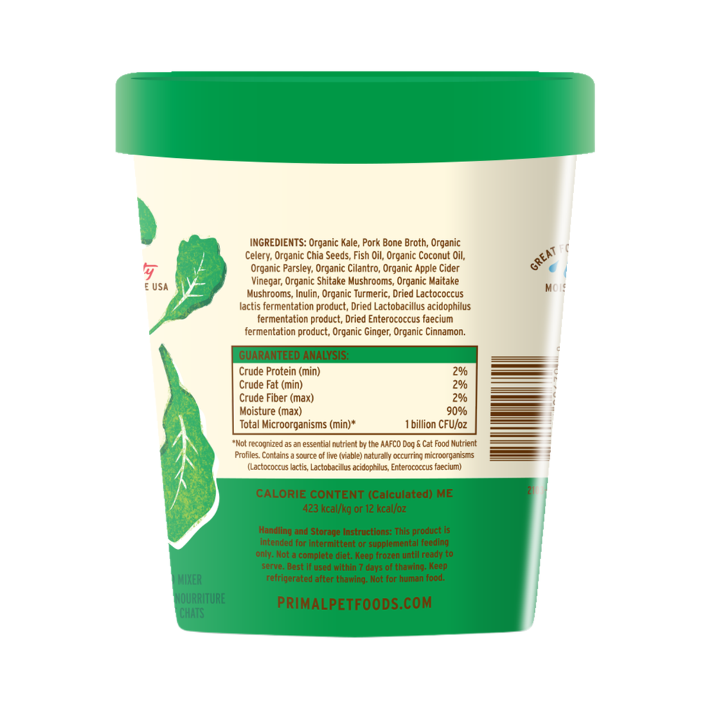 Primal’s Power Greens Fresh Topper for cat and dog food is packed with leafy greens, organic chia seeds, organic mushrooms, coconut oil, and sardine oil to help boost your pet’s immunity. Just thaw in the refrigerator overnight and scoop onto canned, kibble, or freeze-dried food for an easy way to add raw, whole-food nutrition to your dog’s or cat’s diet. Available in 16- and 32-ounce resealable containers.